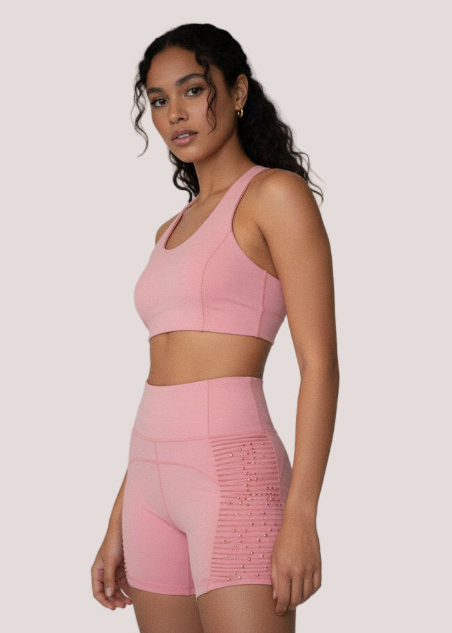 High neck in back with mesh underlining the flowing garland elements cascading downward. Provides medium/high support for impact movements.